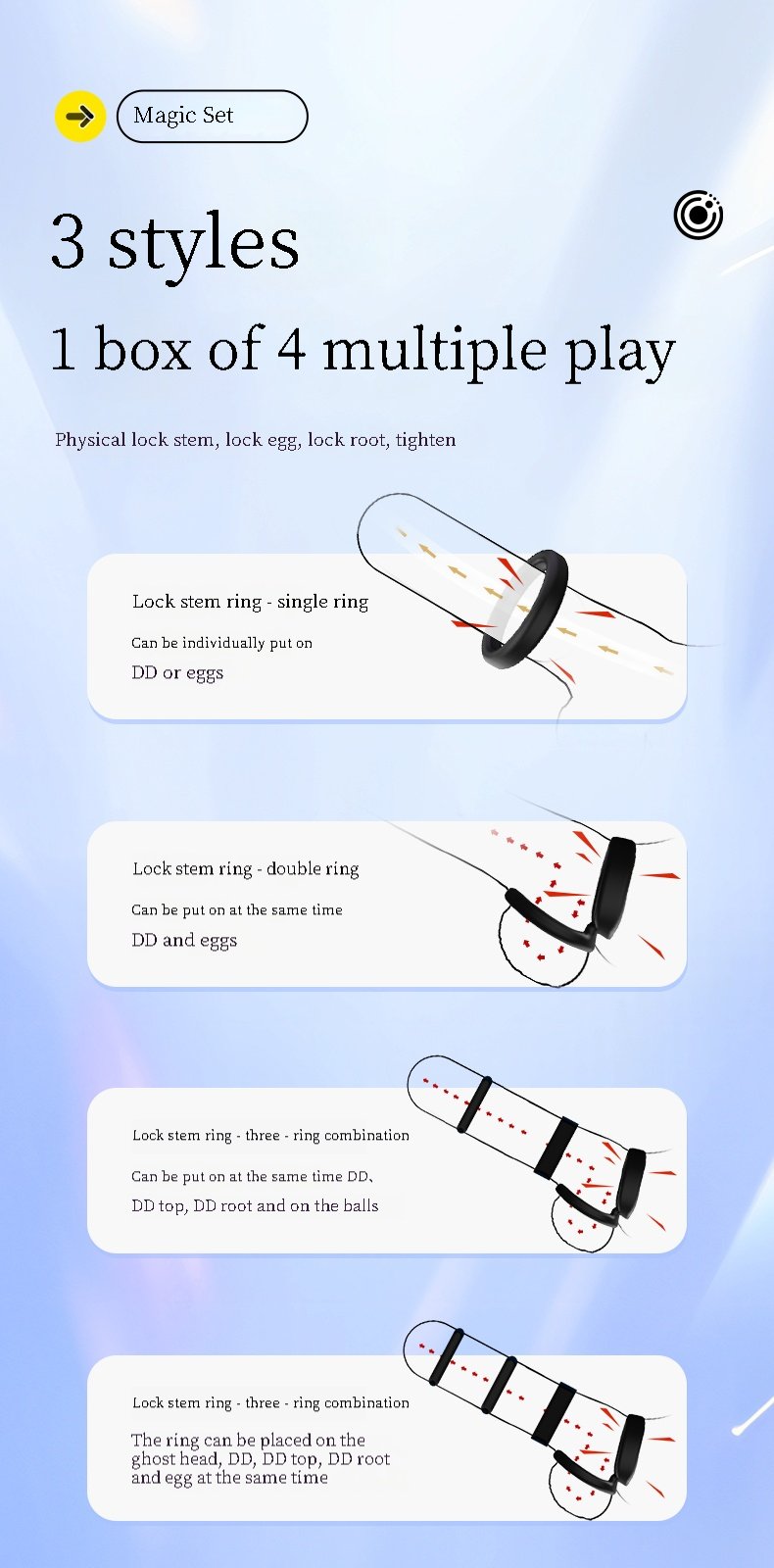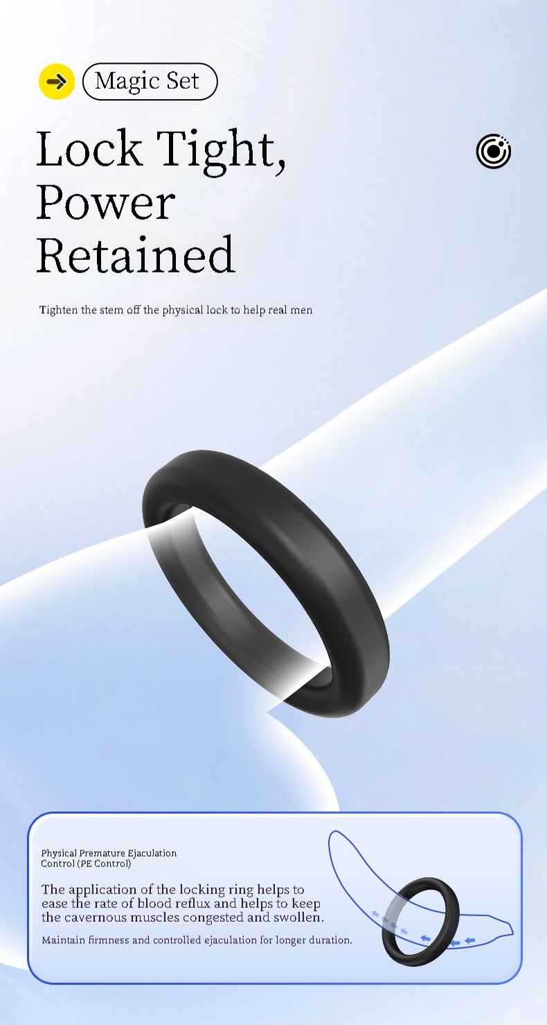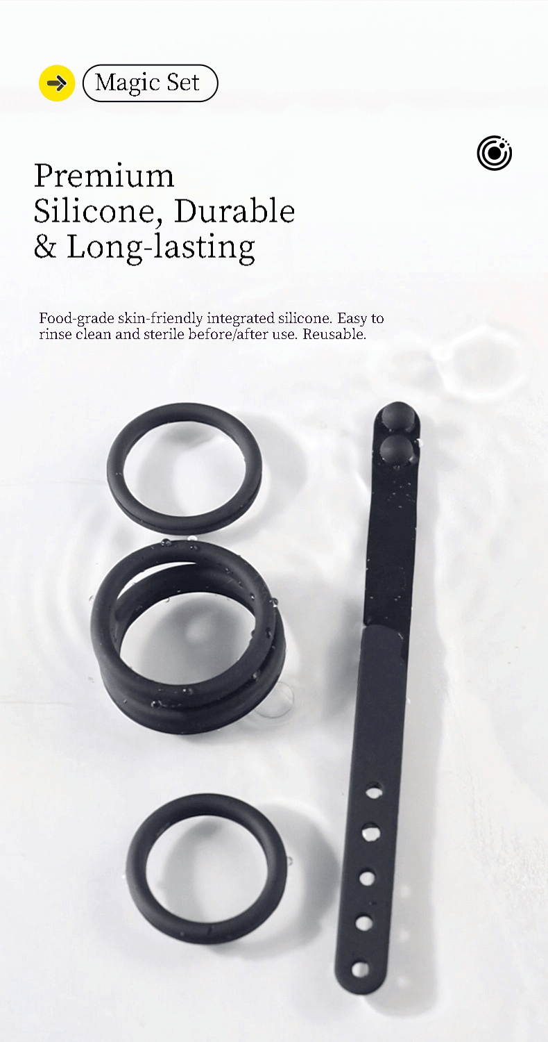 4-Piece Penis Ring Set for All-Night Erection: This tight and firm erection ring set includes 4 male penis rings, allowing you to wear as many as needed! Place two, three, or even more rings on your penis. The extra rings help increase blood flow to the penis, increasing girth and length for your ideal size. They also enhance erection hardness, leading to a more pleasurable sexual experience.