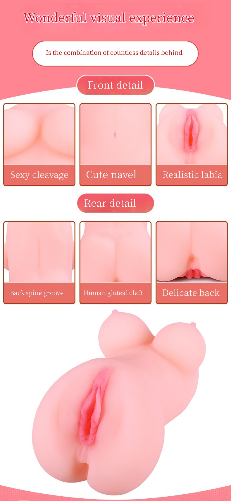 - 【Mini Sex Doll】This compact mini sex doll features a lifelike vagina, a slender waist, and supple breasts. The torso design includes a unique single-channel structure that mimics a tight, realistic vaginal. The channel is reinforced with thick material to prevent damage during vigorous thrusting, allowing for unrestrained enjoyment. Additionally, the tightness of the vaginal grip can be adjusted by hand pressure, enabling users to control the intensity and timing of their climax with ease.