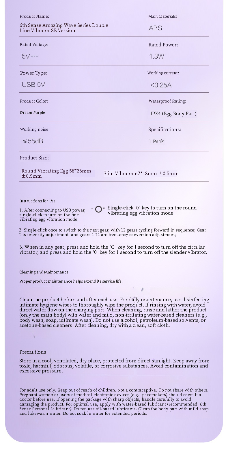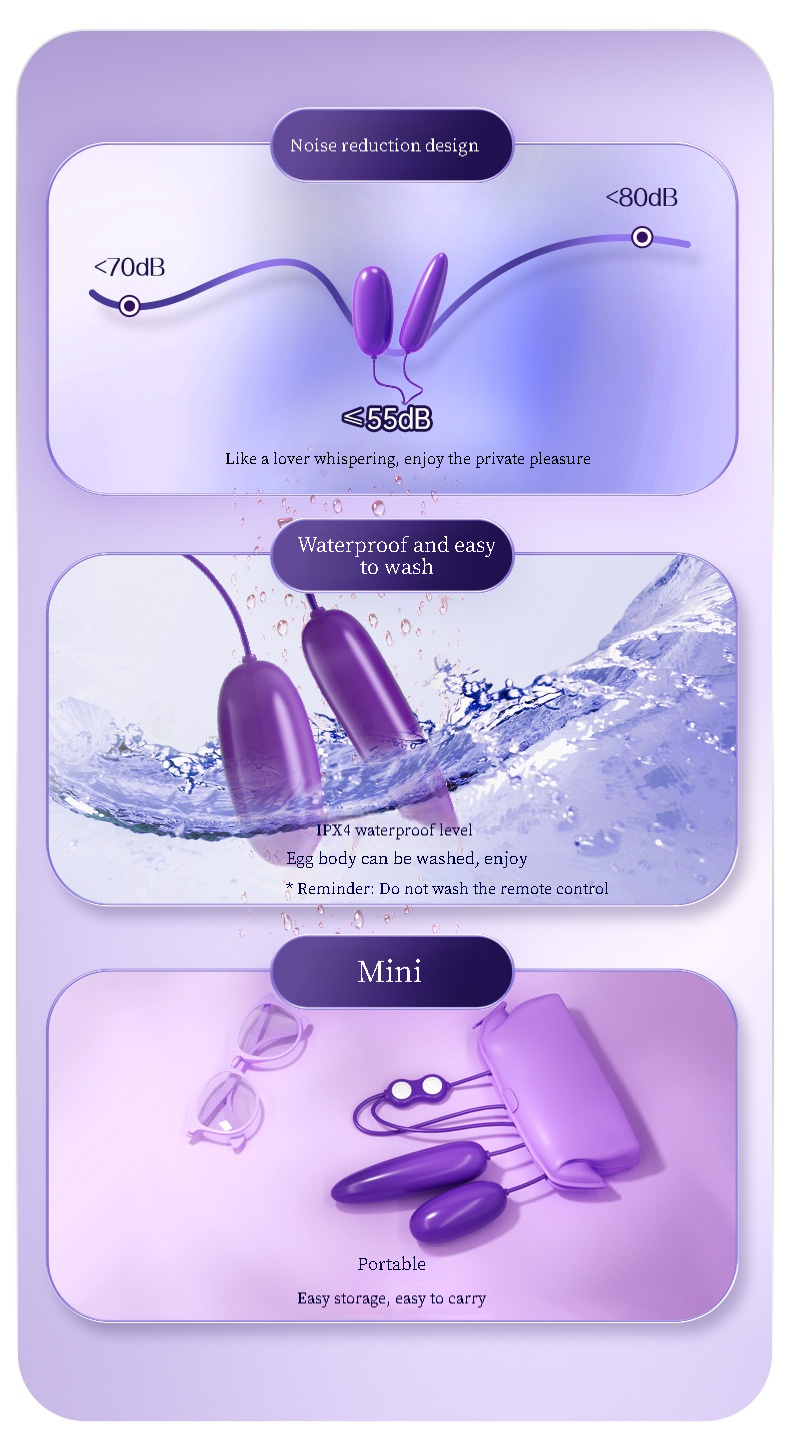Skin-friendly silicone material, IPX4 waterproof, silent design: Made of skin-friendly silicone material, it feels soft and comfortable. Easy to clean (rinse with water, do not immerse in water). The low-noise motor (≤47 decibels) ensures you enjoy private and worry-free time.