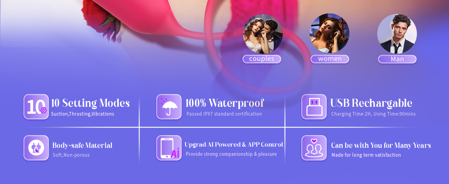 New AI Smart Rose Toy – App Control, Upgraded Intimacy Experience: Take complete control of your pleasure with the app, unlocking unlimited combinations of suction, vibration, and thrusting, as you please. When you crave a deeper experience, switch to AI Lover Mode—an intelligent companion that listens, responds, and considerately adapts to your commands. More than just a vibrator, it’s a beloved companion, bringing you comfort and affection.